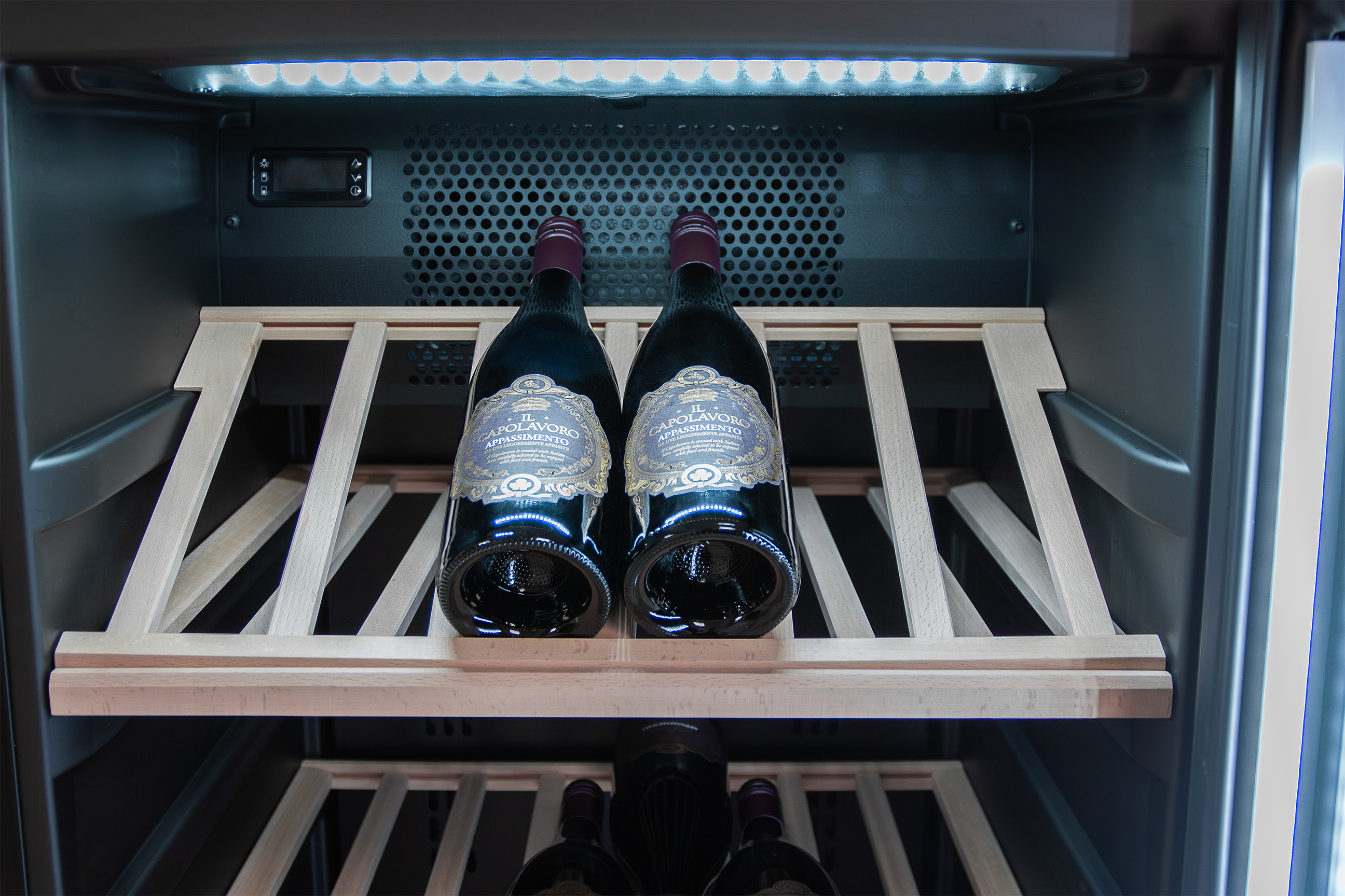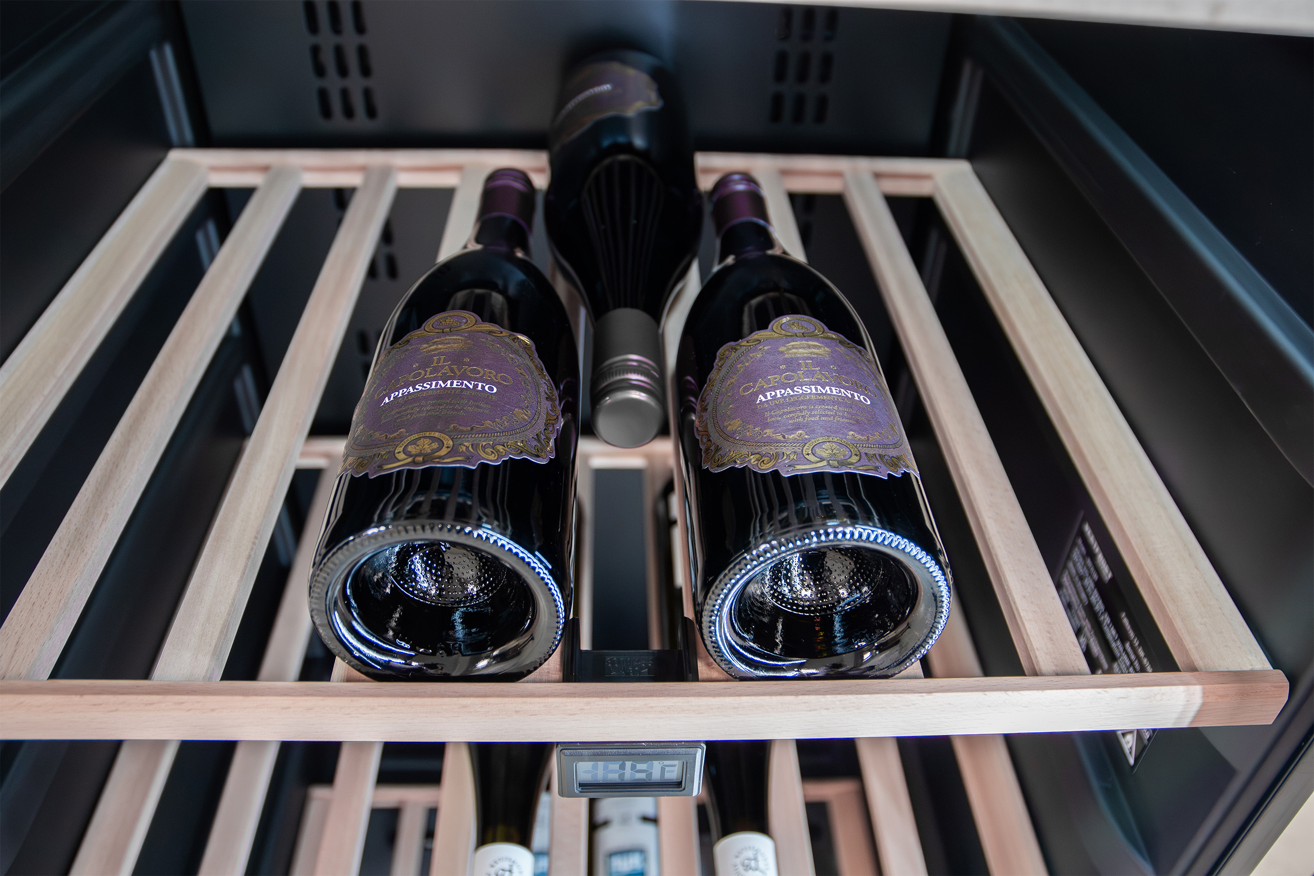 Wine refrigerators with multizone can be set to a bottom and a top temperature. The temperature range goes from 5°C to 22°C. The wine refrigerator is not divided, and therefore the two temperature settings will be mixed in the middle of the cabinet and give an extra third zone. Multizone cabinets can accommodate wines with different temperature requirements and at the same time ensure ready-to-serve wine in the top and / or bottom of the cabinet.
