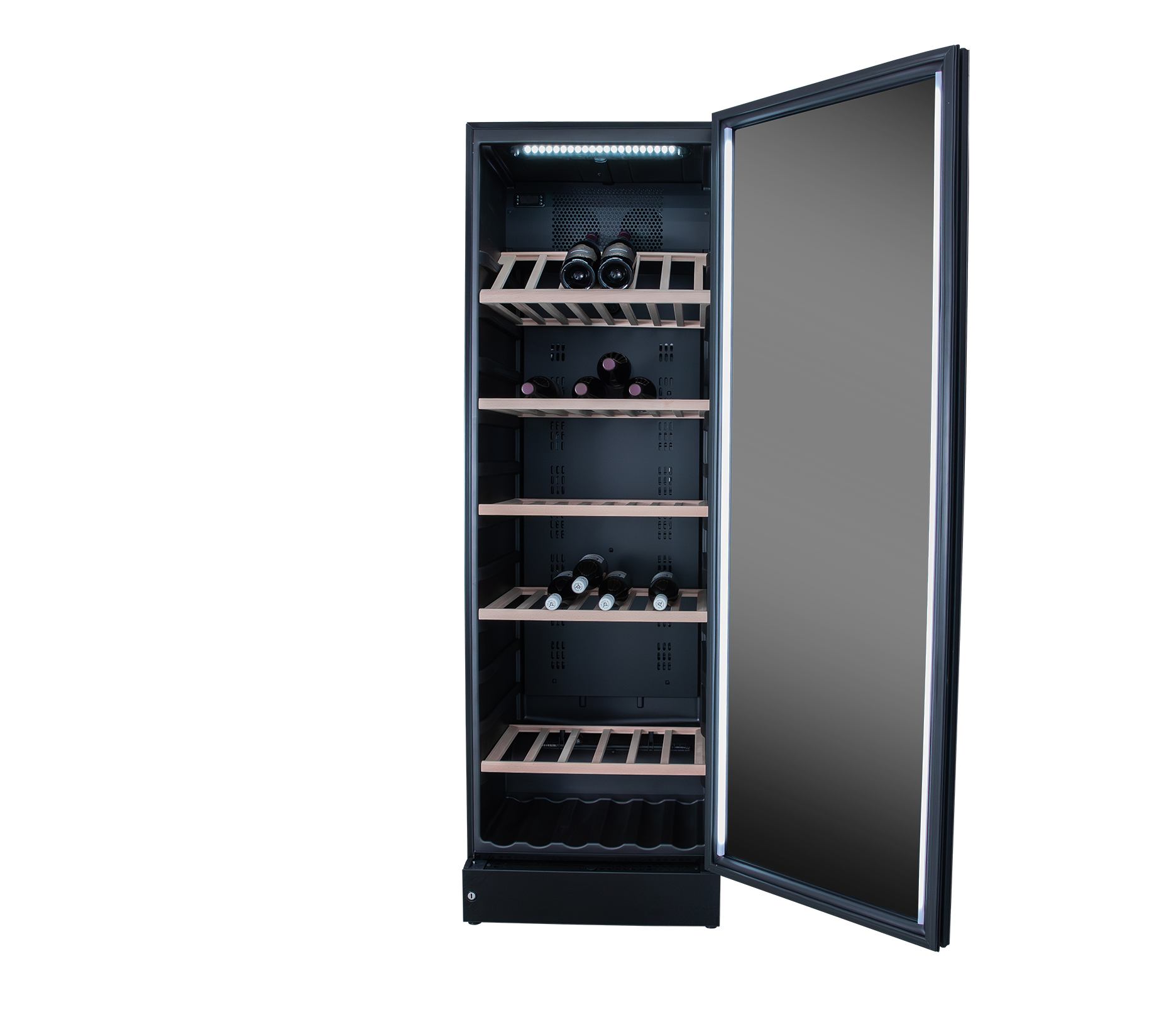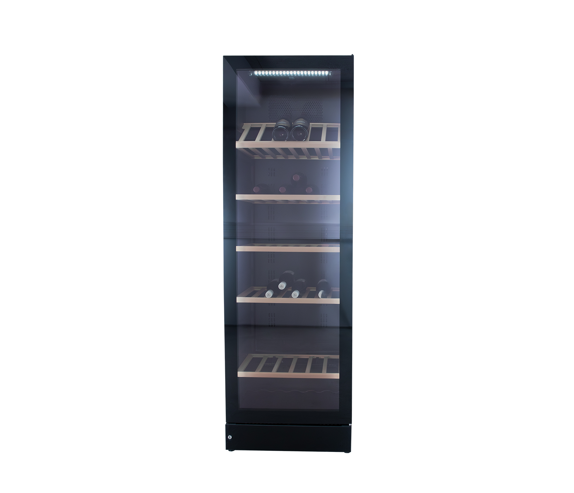 Exclusive full glass wine cabinet with storage room for 197 bottles. The cabinet contains adjustable wooden shelves plus an integrated shelf at the bottom. Made for long-term storage or bringing wine to serving temperature. The temperatures can be set as required between 5°C and 20°C. Full LED lines are built into the cabinet doorframe to provide maximum exposure. A stunning wine cabinet with transparent glass door that makes an elegant addition to any environment.